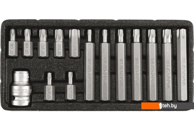 | Комплектация | - TORX 30 мм: T20, T25, T30, T40, T45, T50, T55 - TORX 75 мм: T20, T25, T30, T40, T45, T50, T55 - Переходник 1/2"х10 мм |