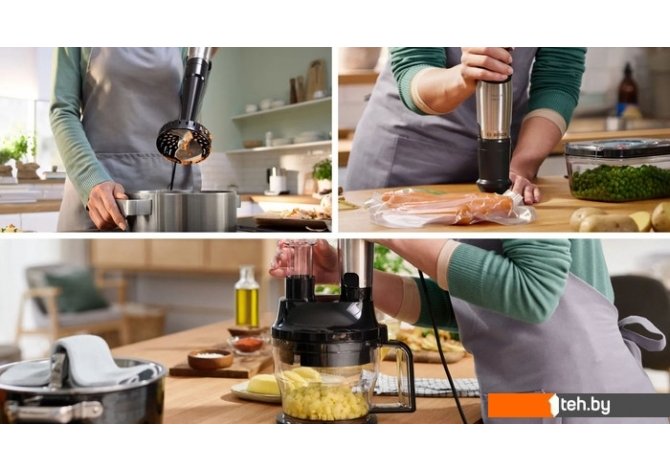 | Комплектация | Блендер из нержавеющей стали с ножем QuattroBlade Измельчитель для специй, орехов, сыра, мяса и многого другого (полезный объем 500 мл) Венчик из нержавеющей стали для взбивания сливок или яичного белка Мерный стакан в комплекте |