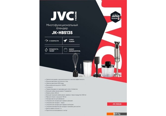 Фотографии, описание и технические характеристики модели блендера JVC JK-HB5135 взяты из открытых источников, официального сайта производителя или представительства JVC в Республике Беларусь.