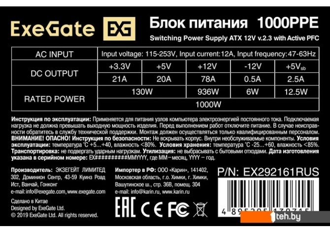 Если хотите купить блок питания ExeGate 1000PPE EX292161RUS-PC то следует уточнить все параметры и габариты модели перед покупкой. Представленые характеристики на сайте 1teh.by могут отличаться от действительных или указанных производителем. Описание, фото товара и технические характеристики представлены для справки.