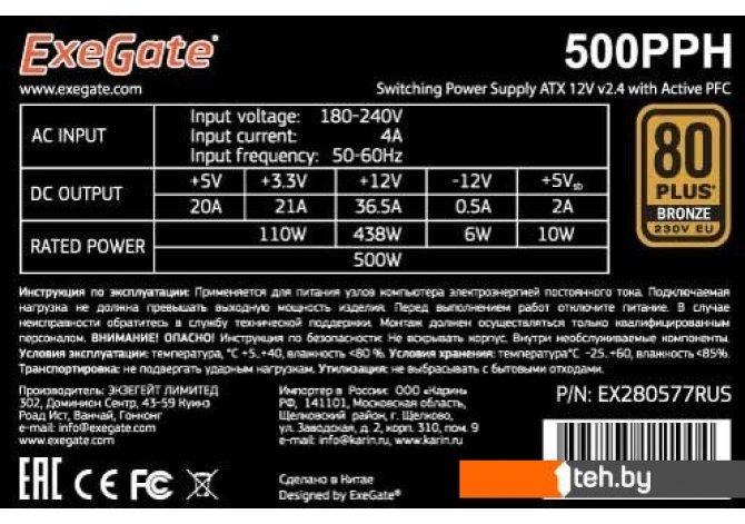 Фотографии, описание и технические характеристики модели блока питания ExeGate 500PPH 80 Plus Bronze EX280577RUS взяты из открытых источников, официального сайта производителя или представительства ExeGate в Республике Беларусь.