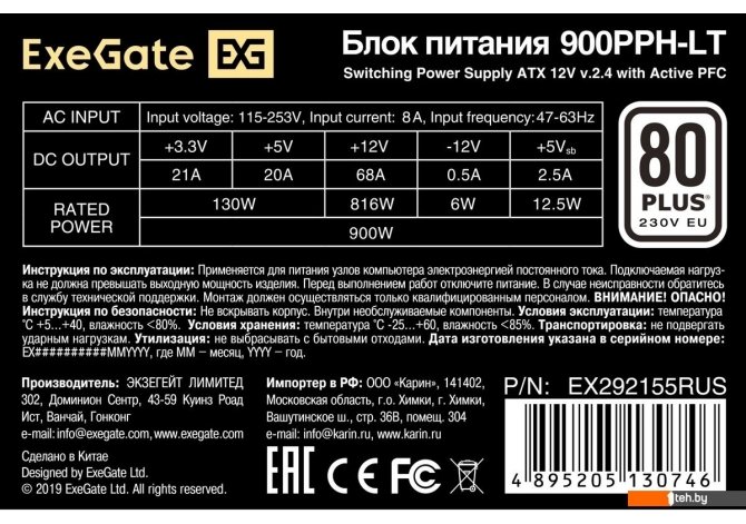 Фотографии, описание и технические характеристики модели блока питания ExeGate 900PPH-LT-OEM EX292155RUS-OEM-S взяты из открытых источников, официального сайта производителя или представительства ExeGate в Республике Беларусь.