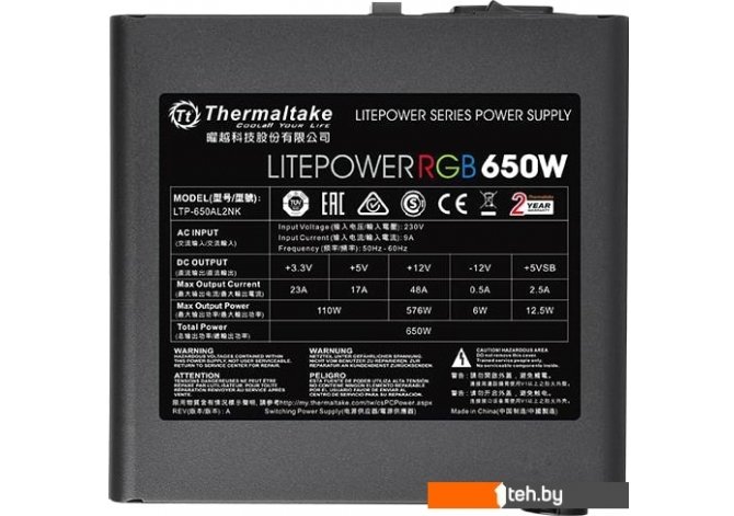 Фотографии, описание и технические характеристики модели блока питания Thermaltake Litepower RGB 650W LTP-650AL2NK взяты из открытых источников, официального сайта производителя или представительства Thermaltake в Республике Беларусь.