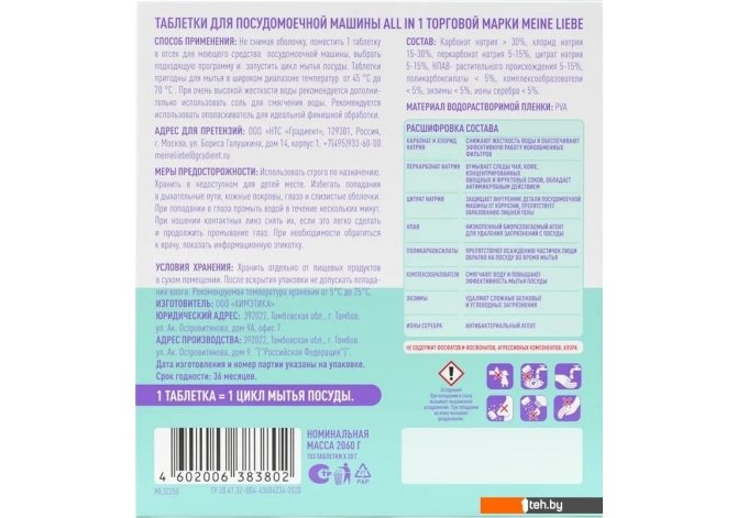 | Состав | моющее средство, ополаскиватель, соль, добавка для защиты металла, добавка для защиты стекла |