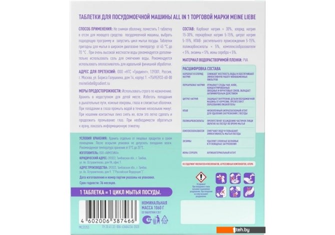 | Информация | - Экологичные и бесфосфатные таблетки для посудомоечной машины All in 1 обеспечивают превосходный результат при мытье посуды. Это средство придаст вашей посуде чистоту и блеск без использования агрессивных компонентов. - Специальные биологические ферменты и активные вещества на основе кислорода эффективно расщепляют остатки пищи и удаляют стойкие загрязнения. Таблетки надежно предотвращают образование известкового налета, что способствует долговечной работе вашей посудомоечной машины. Они не оставляют разводов, нейтрализуют запахи и полностью смываются. - У средства водорастворимая упаковка, которую не нужно вскрывать перед загрузкой в машину. Благодаря экологически безопасному составу, таблетки рекомендованы для использования в домах с автономными канализациями (септиками). Моющее средство подходит для мытья в широком диапазоне температур от 45°C до 70°C. - При высокой жесткости воды (20 dH) рекомендуется дополнительно использовать соль для смягчения воды и ополаскиватель. |