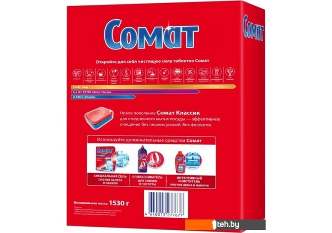 | Информация | ? Мощная формула таблеток для посудомоечной машины Somat Classic с сода-эффектом быстро и эффективно справляется с устойчивыми загрязнениями и засохшими пятнами. ? Таблетки быстро и полностью растворяются в воде, не оставляя разводов на посуде. ?? Таблетки подходят для ежедневного применения. |