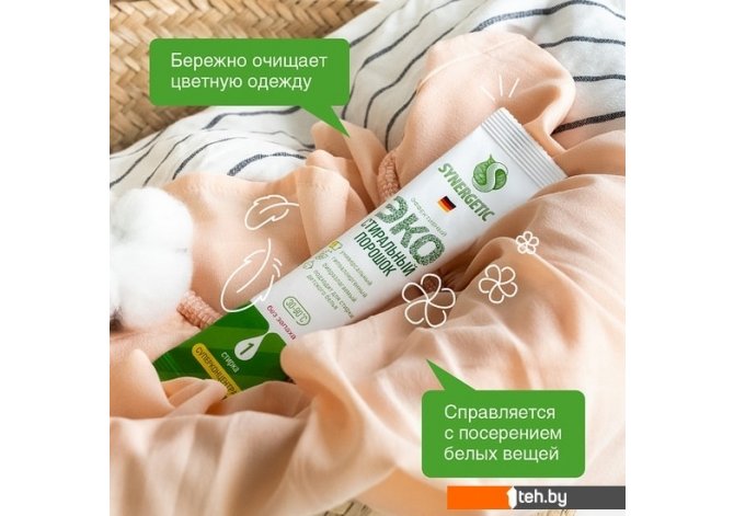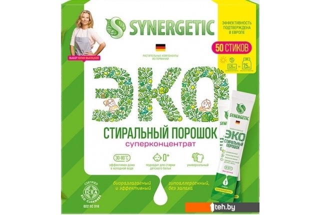| Информация | Стиральный порошок в стиках от SYNERGETIC — необычно, удобно и так просто, что даже думать не надо! 1 стик — обычная стирка, 2 стика — серьезные загрязнения. Умный суперконцентрат, который занимает в 6 раз меньше места по сравнению с привычным вам средством. 25 граммов умного порошка SYNERGETIC заменяют 150 граммов любого другого. Один стик работает так же эффективно, как лидеры рынка, а двойная доза порошка победила всех конкурентов во время исследования. Экологичность: SYNERGETIC удалось создать порошок, который экологичен на всех этапах цикла. Производство: Благодаря отсутствию балластных веществ и современной технологии производства порошок требует в десять раз меньше энергии для производства и сокращает углеродный след. Использование: Экологичные природные компоненты полностью биоразлагаемы и безопасны для аллергиков, астматиков и маленьких детей. |