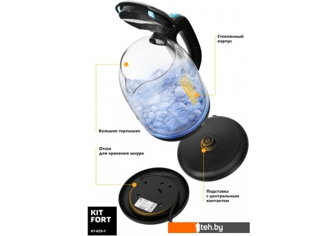 Фотографии, описание и технические характеристики модели чайника Kitfort KT-625-1 (черный/голубой) взяты из открытых источников, официального сайта производителя или представительства Kitfort в Республике Беларусь.