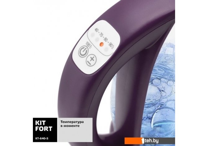 | Информация | Электрический чайник с электронным терморегулятором Kitfort KT-640 может не только вскипятить воду, но и нагреть ее до температуры 40, 70, 80 и 90 °С, что очень удобно при заваривании различных сортов чая. Температура 40 °С пригодится для приготовления детского питания. Чайник также оснащен функцией поддержания температуры. Температура воды контролируется встроенным в дно чайника термодатчиком. |