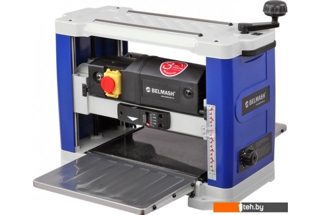 | Информация | Рейсмусовый станок BELMASH P2200MH является модифицированной версией модели BELMASH P2200M. Изделие оснащено литым основанием с отверстиями для крепления к верстаку, несущими стойками, гранитным рабочим столом и откидывающимися удлинителями с ребрами жесткости. Привод устройства ? однофазный коллекторный электродвигатель с двойной изоляцией мощностью 2200 Вт. Модель оборудована индикатором строгания, отображающим высоту снятия за один проход, и рукояткой регулировки, перемещающей рабочую платформу. Установка конечной толщины обработки производится рукояткой настройки суммарной глубины строгания, расположенной на правом торце корпуса. Подача заготовки происходит автоматически. Для возврата предварительно обработанного материала и повторного прогона, в верхней части станка предусмотрены протяжные ролики. Обрезиненные ручки расположены по бокам верхнего ограждения корпуса. Наличие кожуха (крепится двумя винтами-барашками) и универсального адаптера (O53/63/100 мм) позволяет подключать устройство пылеудаления. Патрубок отвода отходов резания направляется как в правую, так и в левую сторону. |