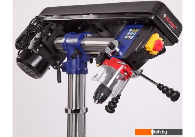 | Информация | Станок предназначен для обработки различных материалов вращающимся режущим или шлифующим инструментом, с целью получения сквозных или глухих отверстий, растачивания, зенкерования.Модель RDP430-16F является радиальной, то есть, возможна регулировка положения сверлильной головы по высоте, относительно колонны, по горизонту и по окружности (вращается вокруг своей оси) Стол, опора и корпус сверлильной головки выполнены из чугуна, что придает станку серьезный вес 55 килограмм. Двигатель асинхронный, мощностью 600 Вт.Самый высокий станок в линейке сверлильного оборудования BELMASH – 1630 мм, подходит для обработки заготовок большой толщины. Максимальное расстояние между шпинделем и столом – 740 мм.Имеется пять ступеней скорости вращения шпинделя, что необходимо при выполнении различных операций и типах материала. Переключение производится за счет переброски ремня. Для этого необходимо открыть крышку ременного отсека, ослабить барашек крепления двигателя, тем самым получив возможность смещения шкива, перекинуть ремень и проделать операцию в обратной последовательности.Заготовку можно крепить как к рабочему столу, так и к основанию, все зависит от ее размера. В комплекте предусмотрены тиски. Для их крепления есть шесть пазов на рабочем столе и два на основании. Шкала, расположенная на рукоятке регулировки глубины сверления, показывает ход пиноли шпинделя, с ее помощью можно настраивать ход пиноли, для этого необходимо провернуть шкалу, стрелка на корпусе будет показывать значение, на которое будет возможно погружение сверла, затем затянуть барашек. Наконечники тройной рукояти удобной формы, что способствует плавной подаче сверла к заготовке. максимальный ход пиноли шпинделя 80 мм. На станке предусмотрен лазерный указатель, который позволяет точно определить точку входа режущего инструмента в заготовку.Патрон быстрозажимной с максимальным диаметром зажимаемого хвостовика инструмента 16 мм. Диаметр стойки (колонны) 73 мм, имеется зубчатая рейка, поднятие/опускание стола настраивается с помощью рукоятки.Управление станком осуществляется тремя кнопками – выключатель лазера - указателя, «пуск» и «остановка», выключатель снабжен крышкой.В опоре имеется два отверстия для крепления к верстаку, что дает дополнительную устойчивость и безопасность. |