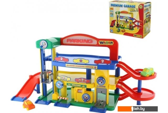 | Информация | Гараж представляет собой трехуровневую парковку для входящих в набор автомобилей (2 шт.). Вывеска гаража "PARKING" с подсветкой. На первом уровне паркинга находятся заправочная станция, автомастерская (подъемник), автомойка. На второй и третий уровень автомобили могут попасть на лифте, а спуститься по съездам. Все указанные игровые элементы приводятся в движение с помощью ручного привода, то есть для игры ребенку нужно повернуть рукоятку возле подвижного элемента. |
