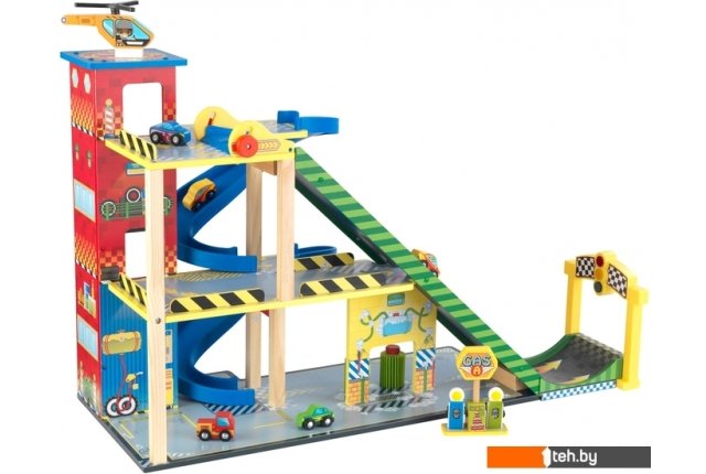 | Состав набора | - Трехуровневый спиральный винтовой съезд - Гараж с парковкой - Лифт, который поднимает автомобили к гоночным съездам - Автозаправочная станция - Автомойка с движущимися щетками - Вертолетная площадка - Вертолет, 5 игрушечных автомобилей - Светофор с индикатором отсчета времени до старта гонки |