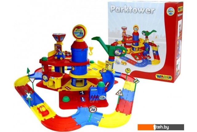 | Информация | Паркинг представляет собой трехуровневую парковку, куда автомобили можно поднимать на лифте, а спускать по съездам. Машинки (2шт.), входящие в набор, можно обслужить в игрушечном автосервисе - проверить автомобиль на подъёмнике, "помыть" на автомойке, а заправить на АЗС, выбрав подходящее топливо. Лифт, мойка и эстакада приводятся в движение при вращении установленных рукояток, так же как и подъемный кран. Паркинг оснащен дорогой с 10 дорожными знаками |