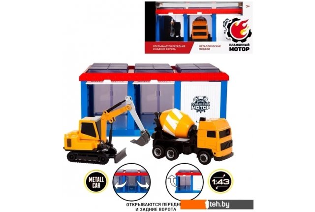 | Информация | Гараж «Строительная техника» от ТМ «Пламенный мотор» с 2-мя машинами: экскаватором и автобетоносмесителем. Благодаря тщательно продуманным деталям игрушки выглядят очень реалистично. Передние и задние ворота открываются и закрываются вручную. Размер гаража (ДхШхВ) составляет 22х14,5х9 см. Машины выполнены в масштабе 1:43. Гараж сделан из пластмассы, машины изготовлены из металла. |