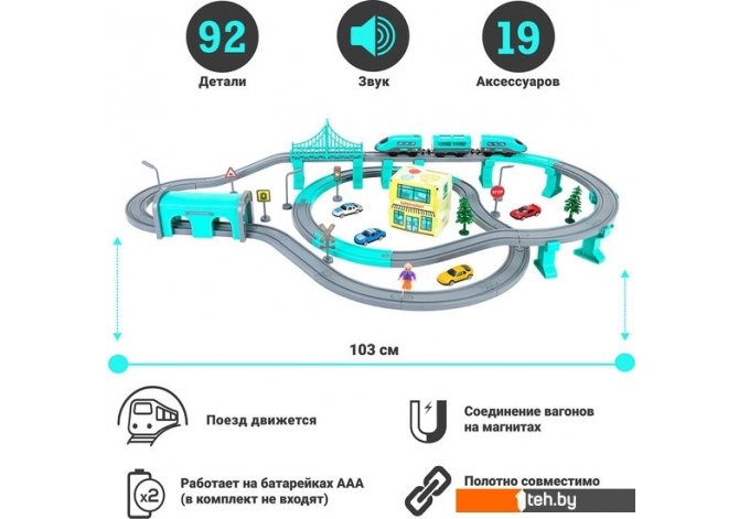 | Информация | Интерактивная железная дорога Мой город порадует для мальчиков и девочек. Игрушка изготовлена из прочного и безопасного пластика, устойчивого к механическому воздействию. Локомотив работает от батареек AAA. При нажатии на кнопку, локомотив самостоятельно поедет по рельсам. При движении через туннель издает звук. В локомотиве открывается кабинка для машиниста, в которую легко можно посадить фигурку человечка. Локомотив выполнен в современном стиле и в дизайне современного города. Вагоны поезда соединяются между собой с помощью надежных магнитов. Комплектация: локомотив, 2 вагона, железная дорогая, мост, туннель, четыре машинки, здание, дорожные знаки - 6шт. и фигурка городского жителя. Все элементы комплекта совместимы с другими сборными моделями железной дороги торговой марки. Юный машинист сможет прокладывать различные маршруты, строить новые станции и придумывать уникальный ландшафт. Большой набор идеально подходит для самостоятельной игры ребенка, так и игры с друзьями. Игра с набором способствует развитию навыков в сюжетно-ролевой игре, стимулирует зрительно-моторную координацию. Железная дорога - отличный подарок на День рождение, Новый год и любой другой праздник. |
