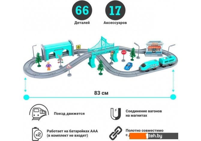 | Информация | Интерактивная железная дорогая Мой город из 66 деталей покорит мальчиков и девочек. Локомотив работает от батареек AAA. При нажатии на кнопку, локомотив самостоятельно поедет по рельсам. Локомотив выполнен в современном дизайне и в ярких цветах. В локомотиве открывается кабинка для машиниста, в которую легко можно посадить фигурку человечка. Вагоны поезда соединяются между собой с помощью надежных магнитов. Комплектация: локомотив, один вагон, железная дорогая, мост, туннель, вертолет, две машинки, магазин, дорожные знаки - 6шт. и фигурка городского жителя. Игрушка изготовлена из прочного и безопасного пластика, устойчивого к механическому воздействию. Все элементы комплекта совместимы с другими сборными моделями железной дороги торговой марки. Юный машинист сможет прокладывать различные маршруты, строить новые станции и придумывать уникальный ландшафт. Игра с набором способствует развитию навыков в сюжетно-ролевой игре, стимулирует зрительно-моторную координацию. Большой набор идеально подходит для самостоятельной игры ребенка, так и игры с друзьями. Железная дорога - отличный подарок на День рождение, Новый год и любой другой праздник. |