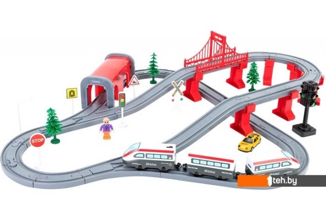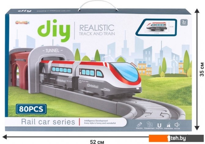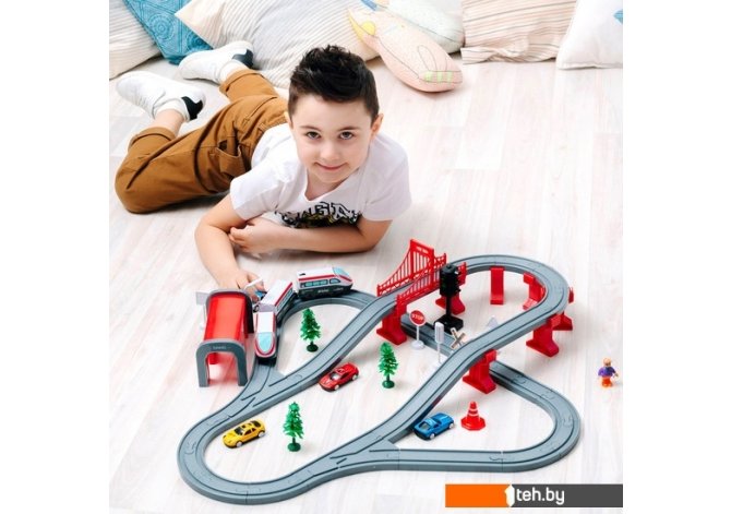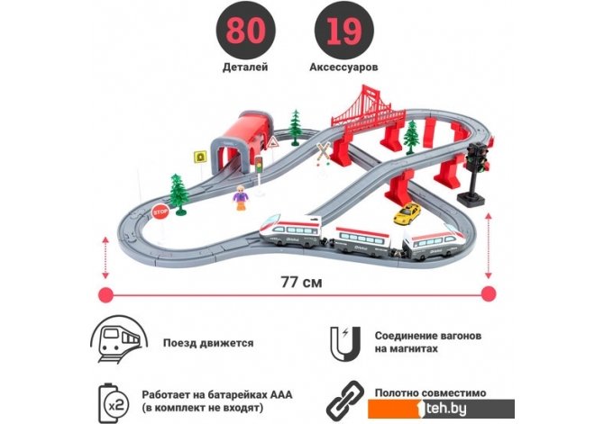 | Информация | Большая интерактивная железная дорога из 80 предметов подходит для мальчиков и девочек. Локомотив имеет яркий современный дизайн. Игрушка изготовлена из прочного и безопасного пластика, устойчивого к механическому воздействию. Локомотив работает от батареек AAA. При нажатии на кнопку, локомотив самостоятельно поедет по рельсам. Вагоны поезда соединяются между собой с помощью надежных магнитов. Комплектация: локомотив, два вагона, железная дорогая, мост, туннель, три машинки, дорожные знаки - 6шт., деревья - 2 шт., фигурка жителя. Игра с набором способствует развитию навыков в сюжетно-ролевой игре, стимулирует зрительно-моторную координацию. Все элементы комплекта совместимы с другими сборными моделями железной дороги торговой марки. Юный машинист сможет прокладывать различные маршруты, строить новые станции и придумывать уникальный ландшафт. Идеальная игрушка для маленьких любителей поездов. Большой набор идеально подойдет для нескольких детей. Железная дорога - отличный подарок на День рождение, Новый год и любой другой праздник. |