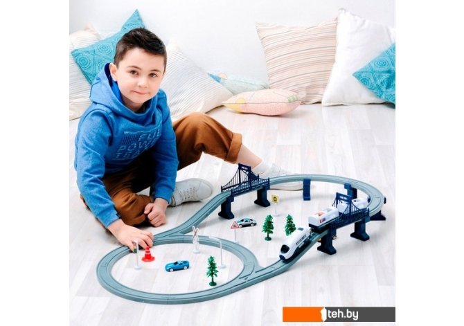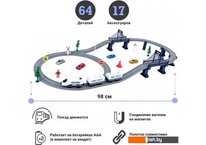 Информация | Интерактивная железная дорога из 64 предмета понравится мальчикам и девочкам. Локомотив работает от батареек AAA. При нажатии на кнопку, локомотив самостоятельно поедет по рельсам. Локомотив имеет яркий современный дизайн. Вагоны поезда соединяются между собой с помощью надежных магнитов. Игрушка изготовлена из прочного и безопасного пластика, устойчивого к механическому воздействию. Игра с набором способствует развитию навыков в сюжетно-ролевой игре, стимулирует зрительно-моторную координацию. Идеальная игрушка для маленьких любителей поездов. Большой набор идеально подойдет для нескольких детей. Комплектация: локомотив, два вагона, железная дорогая, два моста, четыре машинки, дорожные знаки - 6шт., деревья – 3 шт. и фигурка жителя. Все элементы комплекта совместимы с другими сборными моделями железной дороги торговой марки. Юный машинист сможет прокладывать различные маршруты, строить новые станции и придумывать уникальный ландшафт. Железная дорога - отличный подарок на День рождение, Новый год и любой другой праздник. |