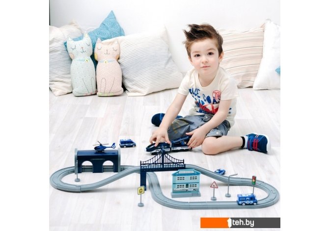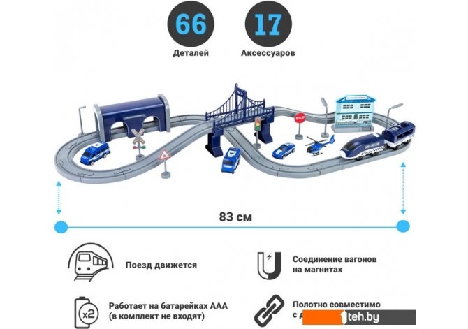 | Информация | Интерактивная железная дорогая из 66 элементов Полицейский участок понравится мальчикам и девочкам от 3 лет. Игрушка изготовлена из прочного и безопасного пластика, устойчивого к механическому воздействию. Локомотив выполнен в современном дизайне в цветах Полиции. Локомотив работает от батареек AAA. При нажатии на кнопку, локомотив самостоятельно поедет по рельсам. В локомотиве открывается кабинка для машиниста, в которую легко можно посадить фигурку полицейского. Вагоны поезда соединяются между собой с помощью надежных магнитов. Большой набор из 66 предметов идеально подходит для самостоятельной игры ребенка, так и игры с друзьями. Комплектация: локомотив, один вагон, железная дорогая, мост, туннель, вертолет, две машинки, здание полиции, дорожные знаки - 6шт. и фигурка полицейского. Все элементы комплекта совместимы с другими сборными моделями железной дороги торговой марки. Юный полицейский сможет прокладывать различные маршруты, строить новые станции и придумывать уникальный ландшафт. Железная дорога - отличный подарок на День рождение, Новый год и любой другой праздник. |