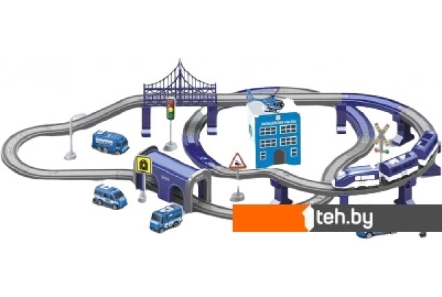| Информация | Данный игровой набор включает детали для сборки железнодорожного пути с мостом и тоннелем, дорожные знаки, фигурку человечка, полицейский участок и 5 металлических транспортных средств: 4 машинки и вертолёт. Ну и, конечно же, в комплекте есть поезд, состоящий из двух вагонов и локомотива. Паровозик может двигаться как по рельсам, так и по полу. Вагоны присоединяются друг к другу благодаря магнитам. В составе железнодорожного пути предусмотрена звуковая рельса. Когда паровозик проезжает по ней, воспроизводятся реалистичные звуки приближающегося поезда. |