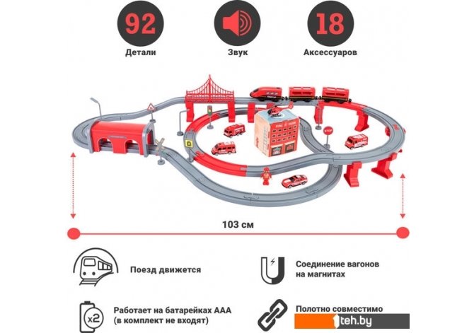 | Информация | Интерактивная железная дорога придется по душе любому мальчику. В комплект входит современный локомотив, здание спасателей, вертолет и специальный транспорт. У малыша будет большой выбор, на чем отправиться на место происшествия. Локомотив помчится, издавая звук. Игровой набор вызовет массу восторга у непоседы и надолго вовлечет его в веселую игру. Он сможет играть как один, так и пригласить друзей. Интерактивная железная дорога для детей от 3 лет. При нажатии на кнопку, локомотив самостоятельно поедет по рельсам. При движении через туннель издает звук. Локомотив работает от батареек AAA. Локомотив выполнен в современном стиле и в дизайне Службы спасения, что понравиться юному любителю поездов. Игрушка изготовлена из прочного и безопасного пластика, устойчивого к механическому воздействию. В локомотиве открывается кабинка для машиниста, в которую легко можно посадить фигурку спасателя. Вагоны поезда соединяются между собой с помощью надежных магнитов. Большой набор идеально подходит для самостоятельной игры ребенка, так и игры с друзьями. Игра с набором способствует развитию навыков в сюжетно-ролевой игре, стимулирует зрительно-моторную координацию. Комплектация: локомотив, 2 вагона, железная дорогая, мост, туннель, четыре машинки, вертолет, здание спасательной службы, дорожные знаки- 6шт., фигурка спасателя. Все элементы комплекта совместимы с другими моделями железной дороги торговой марки. Юный спасатель сможет прокладывать различные маршруты, строить новые станции и придумывать уникальный ландшафт. Железная дорога - отличный подарок на День рождение, Новый год и любой другой праздник. |