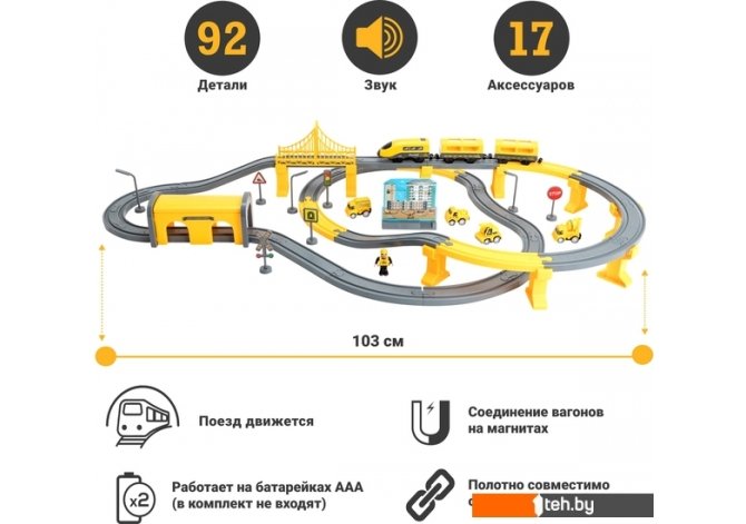 | Информация | В комплекте: современный локомотив, строительный участок со специальным транспортом. У ребенка будет большой выбор, как осуществлять постройки различных сооружений, доставлять строительные материалы. Локомотив помчится по железной дороге со звонким звуком. Игровой набор вызовет массу восторга у малыша и надолго вовлечет его в веселую игру. Он сможет играть как один, так и пригласить друзей. Локомотив работает от батареек AAA. При нажатии на кнопку, локомотив самостоятельно поедет по рельсам. При движении через туннель издает звук. Локомотив выполнен в современном стиле и в дизайне Строительной службы. В локомотиве открывается кабинка для машиниста, в которую легко можно посадить фигурку строителя. Вагоны поезда соединяются между собой с помощью надежных магнитов. Игрушка изготовлена из прочного и безопасного пластика, устойчивого к механическому воздействию. Игра с набором способствует развитию навыков в сюжетно-ролевой игре, стимулирует зрительно-моторную координацию. |