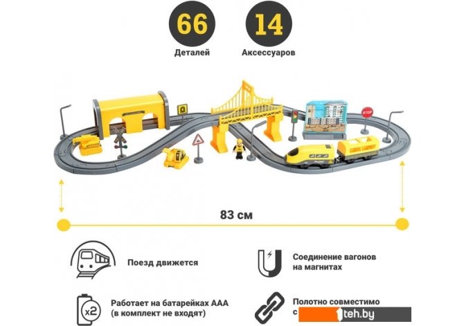 Информация | Интерактивная железная дорогая из 66 предметов Строительная площадка покорит любого мальчика. Игрушка изготовлена из прочного и безопасного пластика, устойчивого к механическому воздействию. Локомотив выполнен в современном дизайне в цветах Строительной службы. В локомотиве открывается кабинка для машиниста, в которую легко можно посадить фигурку строителя. Локомотив работает от батареек AAA. При нажатии на кнопку, локомотив самостоятельно поедет по рельсам. Вагоны поезда соединяются между собой с помощью надежных магнитов. Комплектация: локомотив, один вагон, железная дорогая, мост, туннель, две машинки, фигурка строительного объекта, дорожные знаки - 6шт. и фигурка строителя. Игра с набором способствует развитию навыков в сюжетно-ролевой игре, стимулирует зрительно-моторную координацию. Большой набор идеально подходит для самостоятельной игры ребенка, так и игры с друзьями. Юный строитель сможет прокладывать различные маршруты, строить новые станции и придумывать уникальный ландшафт. Все элементы комплекта совместимы с другими сборными моделями железной дороги торговой марки. Железная дорога - отличный подарок на День рождение, Новый год и любой другой праздник. |