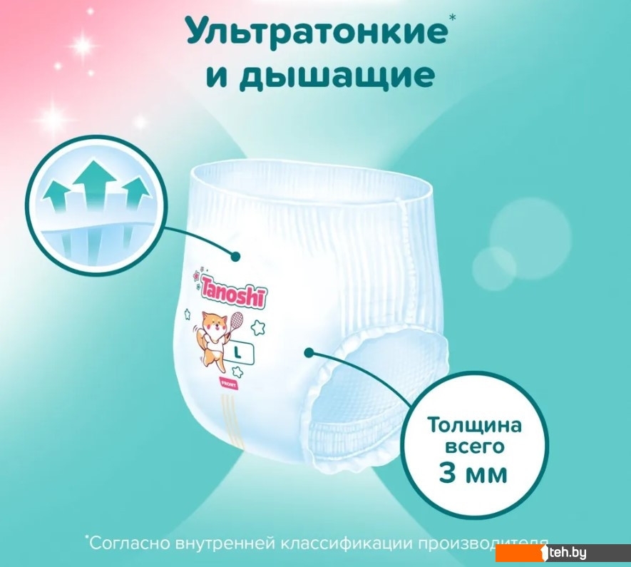 | Информация | - Трусики-подгузники Tanoshi Baby Pants M 6-11 кг (72 шт) - ультратонкие и мягкие, как хлопковое белье, идеально подходят для активных малышей. Специальный состав обеспечивает длительную сухость кожи между сменой трусиков, не вызывая раздражения или опрелостей. Легко одеваются и не сползают во время ношения. Подходят как для мальчиков, так и для девочек. Гипоаллергенные, без отдушек и пропиток, одобрены педиатрами и прошли клинические исследования. Рекомендованы для детей с чувствительной кожей. |