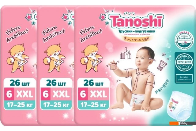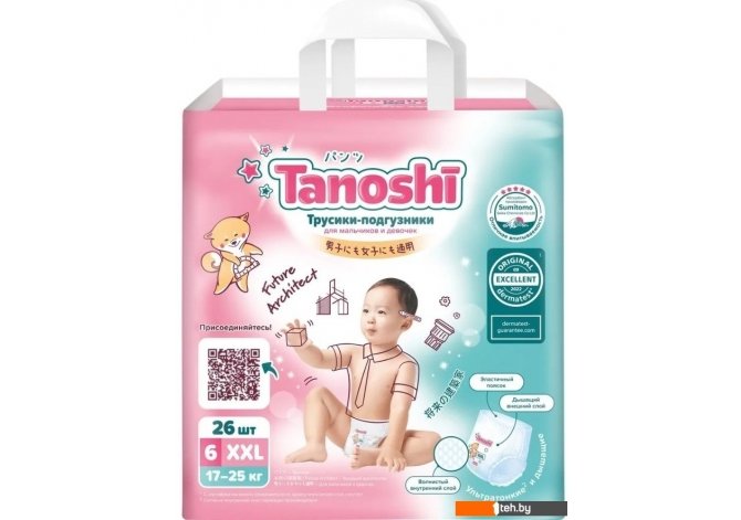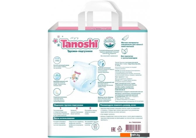 Фотографии, описание и технические характеристики модели Tanoshi Baby Pants XXL 17-25кг (78 шт) взяты из открытых источников, официального сайта производителя или представительства Tanoshi в Республике Беларусь.