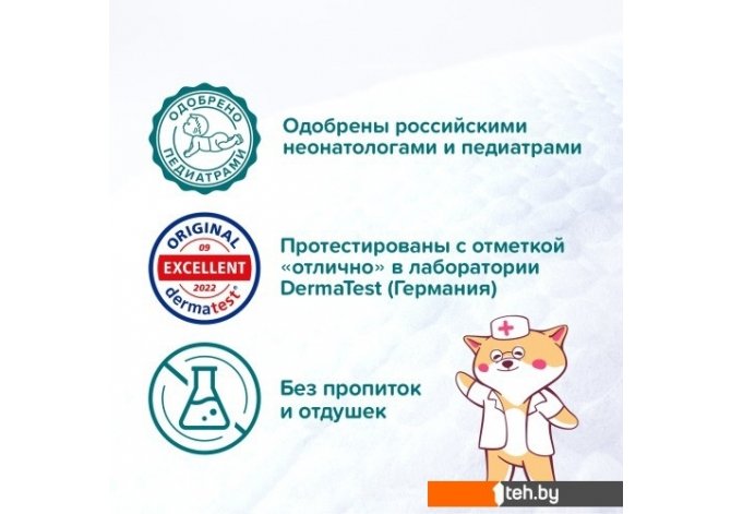 | Информация | Ультратонкие и мягкие детские подгузники для малышей — лучший выбор родителей, для которых важны доказанное качество. С подгузниками Baby Diapers кожа малыша надежно защищена от опрелостей, раздражения и «парникового эффекта» без присыпок и детского крема под подгузник. Подгузники не натирают, не оставляют следов на коже и не ограничивают движений малыша. Состав. Нетканое волокно из целлюлозы, произведенное по технологии AirLaid («воздушная укладка»), позволяет сделать подгузники ультратонкими, но при этом отлично впитывающими и не протекающими. Суперабсорбент от японского производителя Sumitomo гарантирует мгновенную впитываемость и равномерное распределение влаги по всей поверхности подгузника. Невероятно мягкий и комфортный волнистый внутренний слой минимизирует контакт нежной кожи малыша с поверхностью подгузника. Микроскопические отверстия во внешнем слое подгузника обеспечивают выведение прелого воздуха, оставляя при этом влагу внутри впитывающего слоя. Двойные мягкие оборочки вокруг ножек малыша и эластичная резиночка на спинке хорошо прилегают к телу ребенка и защищают от протеканий. Тонкие и мягкие, не заметны под одеждой, комфортны для малыша и неощутимы на коже даже в жаркую погоду. А собраться на прогулку станет веселее вместе с красочным дизайном подгузников с улыбающейся собакой японской породы Сиба-Ину. С подгузниками удобно и родителям, и малышу! Особенности. Округлые многоразовые липучки не царапают кожу ребенка и расстегиваются во время смены подгузника бесшумно. Меняйте подгузник, когда захотите, даже если ваш малыш чутко спит! Цветной индикатор наполнения подскажет, когда подгузник пора сменить на новый. Одинаково хорошо подходят для мальчиков и для девочек. Подгузники созданы экспертами отрасли с многолетним опытом и сочетают в себе все самые лучшие разработки последних лет в изготовлении детских подгузников. Гипоаллергенные, не стесняющие движения малыша, сохраняют кожу ребенка сухой между сменой подгузника. Не содержат отдушек и пропитки. Одобрены педиатрами, прошли клиническое исследование в НИИ Детства Минздрава МО РФ и проверку на дерматологическую безопасность с отметкой «отлично» в лаборатории DermaTest (Германия). |