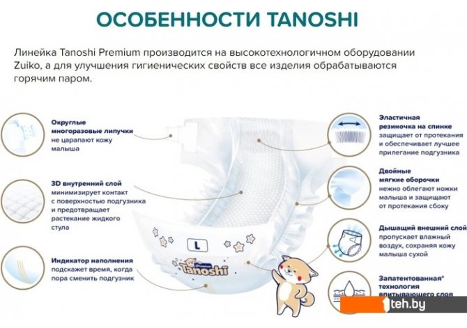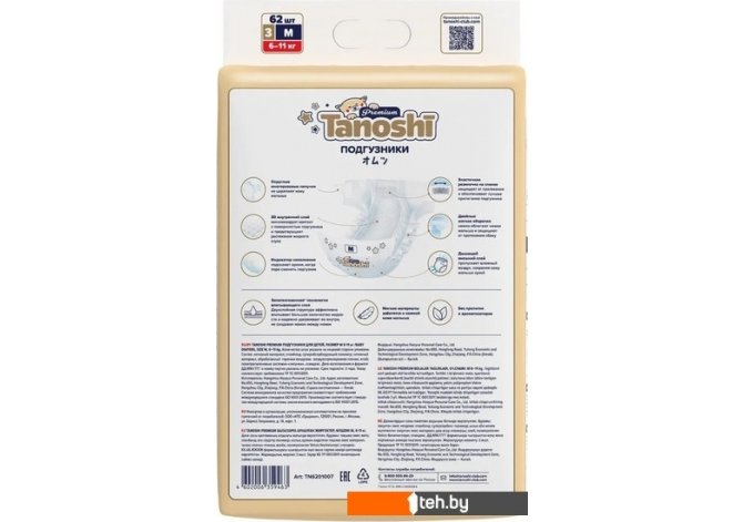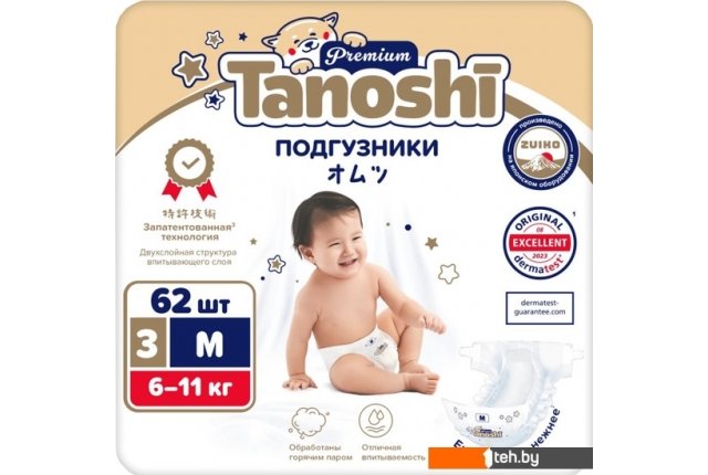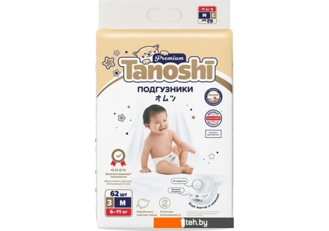 Фотографии, описание и технические характеристики модели Tanoshi Premium Baby Diapers M 6-11 кг (62 шт) взяты из открытых источников, официального сайта производителя или представительства Tanoshi в Республике Беларусь.