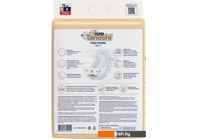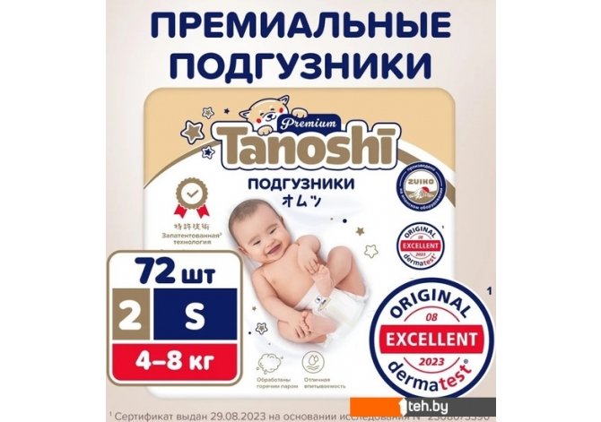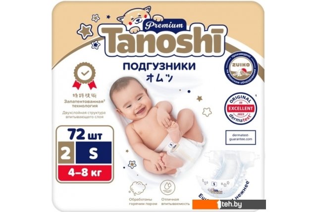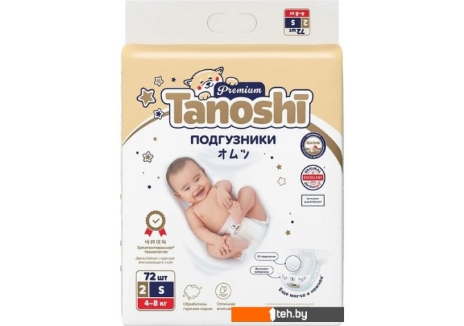 Фотографии, описание и технические характеристики модели Tanoshi Premium Baby Diapers S 4-8 кг (72 шт) взяты из открытых источников, официального сайта производителя или представительства Tanoshi в Республике Беларусь.