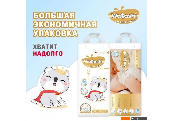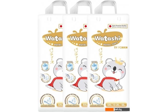Фотографии, описание и технические характеристики модели Watashi Royal Soft 5 XL 13-20 кг (150 шт) взяты из открытых источников, официального сайта производителя или представительства Watashi в Республике Беларусь.