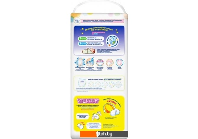 | Информация | ? Детские одноразовые японские трусики-подгузники для малышей Merries XXL 15-28 (32 шт) созданы с особенной заботой о коже и комфорте Вашего ребенка. Идеально подойдут малышу, который активно двигается, бегает и исследует мир вокруг. Трусики легко снимать, надевать и удобно носить. Они хорошо сидят на талии, не сползают, не жмут и не оставляют следов на нежной коже малыша. Трусики хорошо подходят как дневные подгузники, когда ребенок максимально подвижен, так и в качестве ночных подгузников, когда малыш дольше не переодевается. Двойной впитывающий слой по всей поверхности трусиков предотвращает протекание, когда ребенок долго лежит на спине. А оборочки нежно облегают ножки и не образуют щелей, даже если ребенок много ворочается ночью. Гипоаллергенные материалы не вызывают раздражений, опрелостей и дискомфорта. Полимерный абсорбент отлично впитывает большое количество жидкости, превращает ее в гель и защищает от протеканий даже при значительном надавливании. Гладкая, шелковистая поверхность из тончайших волокон максимально сокращает трение при движении малыша. Обновленная технология трех воздухопроницаемых слоев сохраняет кожу малыша сухой и здоровой, обеспечивая свободное выведение прелого воздуха из подгузника. Внутренняя поверхность трусиков остается удивительно мягкой для кожи ребенка и не прилипает к попке даже после того, как впитает большой объем жидкости. Трехполосный индикатор наполнения легко проверить, не раздевая полностью малыша. Если полоски сменили цвет, трусики пора заменить на новые. Мягкий эластичный поясок не давит на животик и растягивается в 2.5 раза, что позволяет легко сменить трусики, когда малыш лежит. Ультразвуковой метод соединения боковых швов делает шов более мягким. Теперь при смене подгузника он разрывается еще легче, а при ношении трусиков не ощутим для малыша, не натирает и не оставляет следов на коже. Эластичная лента для утилизации растягивается в 2 раза и надежно фиксирует даже переполненный подгузник. Более широкий впитывающий слой по всей области между ножек не позволяет жидкости скапливается в одном месте, поэтому трусики не сбиваются в комок, не провисают и не создают дискомфорта, даже когда они уже наполнены. Трусики подходят для девочек и для мальчиков. Не требуют использования защитных кремов и присыпок. |