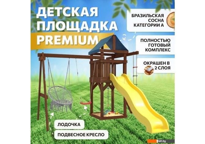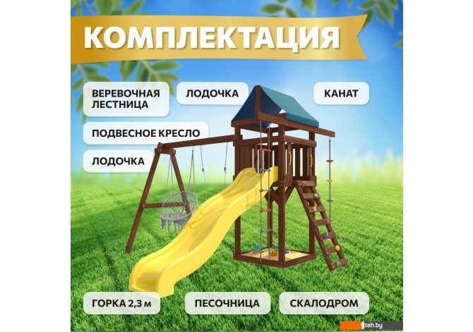 | Информация | - Игровой комплекс National Tree Company с качелями лодочка и подвесным плетеным креслом IgroWoods ДП-2 Premium представляет собой многофункциональную детскую площадку для активного отдыха на свежем воздухе. - Площадка изготовлена из долговечной бразильской сосны и окрашена в 2 слоя для защиты от внешних воздействий. - Все элементы площадки выполнены из безопасных материалов, прошли предварительную шлифовку и имеют закругленные края, чтобы исключить возможность получения травм. - Детская игровая площадка подходит для детей от 3 до 14 лет и способствует развитию физической формы, координации движений и логического мышления. - Садовые качели подвесные для улицы детские и взрослые выдерживают общий вес до 250 кг и предназначены для отдыха и развлечений на свежем воздухе. - Допустимая нагрузка на горку - 50 кг - Допустимая нагрузка на навесное оборудование - 80 кг |