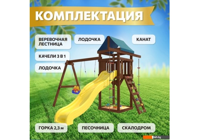 | Информация | - Игровой комплекс National Tree Company с качелями лодочка и качелями 3 в 1 IgroWoods ДП-5 Premium представляет собой многофункциональный игровой комплекс для активного отдыха детей на свежем воздухе. - Площадка плотно окрашена в 2 слоя, что обеспечивает прочность и защиту от внешних воздействий. - Изготовленная из бразильской сосны, площадка обработана специальными составами для большего срока использования и предохранения от разрушения древесины. - Все элементы проходят предварительную шлифовку, а края изделия закруглены, что исключает возможность получения травм. - В комплекте с площадкой идет вся необходимая фурнитура для сборки. - Детская игровая площадка является многофункциональным спортивным игровым комплексом для детей от 3 до 14 лет. - С помощью этой площадки дети смогут развить свою физическую форму, координацию движений и логическое мышление. - Садовые качели подвесные для улицы детские и взрослые, подойдут абсолютно для всех, так как выдерживают общий вес до 250 кг. - Допустимая нагрузка на горку - 50 кг, на навесное оборудование - 80 кг. |
