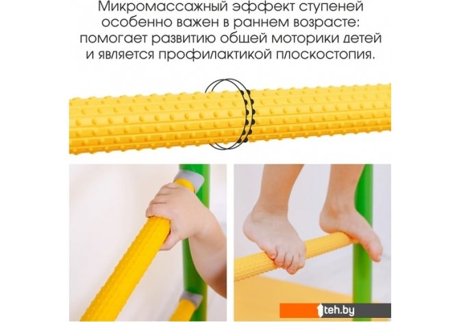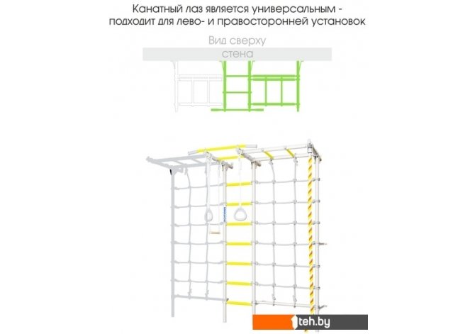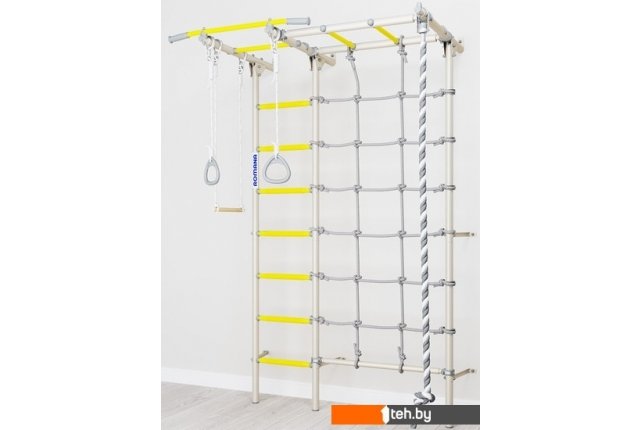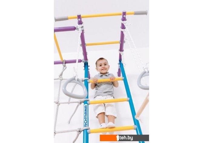 | Информация | В детском спортивном комплексе есть все, что нужно юному искателю приключений: удобная лестница, веревочный лаз из прочного шнура, рукоход и турник. Также в комплекте идет навесное оборудование: канат, кольца и трапеция. Конструкция комплекса прочная и выдерживает человека весом 100 кг (нагрузка при испытаниях комплекса — 200 кг). Лестница снабжена массажными ступенями, хорошо развивающими тактильные ощущения и моторику.Комплекс может разместиться в большинстве квартир, он занимает всего 1,2 метра в длину. |