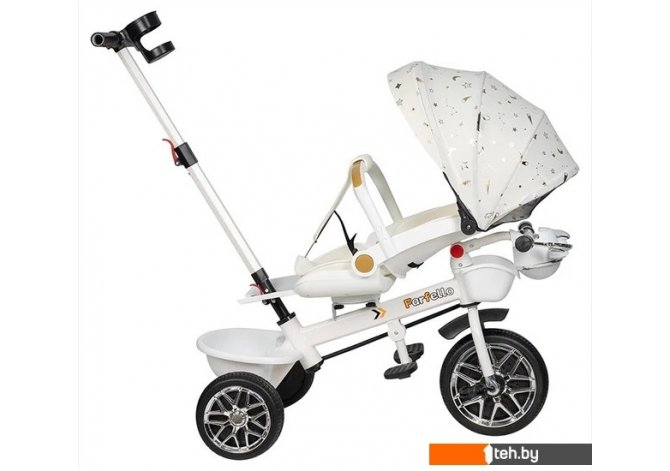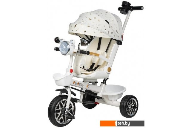 | Информация | ? Мягкое сиденье с поворотом на 360° и регулируемой спинкой. ? Трехточечный ремень безопасности с мягкими наплечниками и тканевый разделитель для ножек. ? Съемные задние колеса с стояночным тормозом. ? Руль с системой наклона. ? Складные подставки для ног и подстаканник. ? Регулируемая высота родительской ручки. ? 2 открытые корзины и выдвижная подставка для ног. ? Большая передняя фара со светомузыкой. |