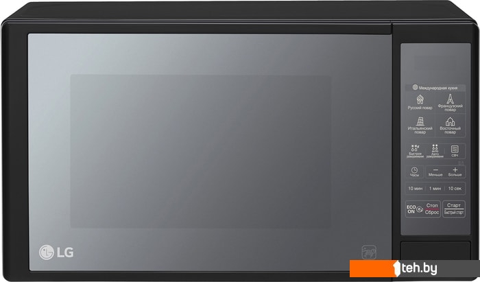 - 20-28 л. Средний размер. Могут иметь дополнительные режимы. Такие печи считаются самыми востребованными. Хороший пример — Samsung MS23T5018AP/BW с вместительностью 23 л, мощностью 800 Вт и несколькими дополнительными программами, в том числе размораживание и поддержание тепла.