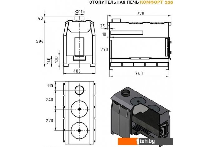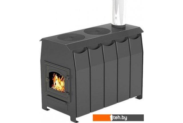 | Информация | Печь обогреет до 300 кубических метров жилых или административно-хозяйственных помещений.Высокая экономичность и теплоотдача печи обеспечивается наличием воздухозаборников, действующих на основе естественных конвекционных потоков и помогающих быстро смешать и прогреть воздух в отапливаемом помещении. Кроме этого, конвекционный кожух защищает от воздействия инфракрасного излучения.После разогрева помещения, режим горения на одной закладки топлива поддерживается до 6 часов. Интенсивность процесса горения можно регулировать с помощью изменения положения шибера на дымовой трубе и зольника, прикрывая его для ослабления мощности горения, или приоткрывая, для усиления.Печь оснащена варочной поверхностью с усиленной чугунной конфоркой для приготовления еды или разогрева воды. Наличие ребер жесткости делают конфорку более прочной и помогают равномернее и быстрее прогревать посуду.Наиболее уязвимые элементы: колосниковая решетка и топочная дверца отлиты из специального чугунного сплава. Это выгодно отличает печь от аналогов с металлическими дверками, которые быстро деформируются и перестают подходить к топочному проему, тем самым нарушая герметичность печи.Дымоход с диаметром 115 мм имеет удобное расположение подключения сверху. При таком подключении экономится пространство помещения необходимое для подключения дымохода сбоку, а также отпадает необходимость в приобретении тройника для монтажа дымоходной трубы.Широкий проем и длина топки позволяет удобно закладывать стандартные поленья до 74 см. |