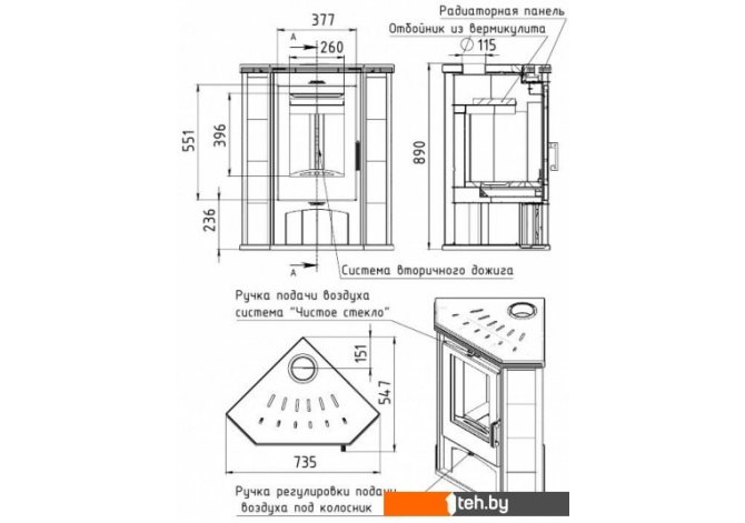 | Информация | Компактная угловая печь с диаметром дымоходного патрубка 115 мм. Печь оснащена системой «регулируемого вторичного дожига». Дополнительная конвекция предусмотрена на верхней крышке печи. Идеально подходит для обогрева небольшого загородного домика площадью 30-60 м2. Размер поленьев 25 -27 см. Подсоединение к дымоходу сверху. |