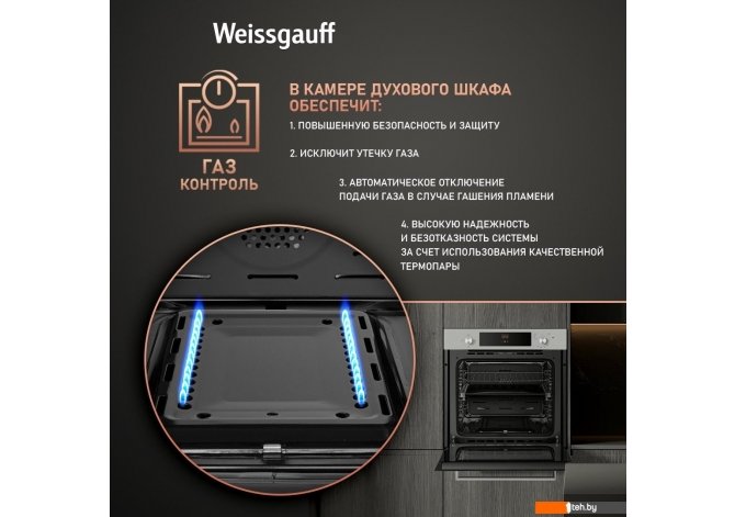 | Информация | - Газовый духовой шкаф от Weissgauff, выполненный в цвете "нержавеющая сталь", оснащённый механическими поворотными рукоятками Soft Switch, дисплеем с сенсорным управлением и 3 режимами, буквально олицетворяет собой уверенность в надёжном и функциональном оснащении вашей кухни! - Объем 67 литров - дает вам полную уверенность в том, что приобретая этот духовой шкаф, вы сможете разместить в нем сразу весь необходимый объем пищи, и даже профессионально работать на нескольких уровнях одновременно, порадовав себя и своих близких настоящим пиром, приготовленным в духовом шкафу Weissgauff на действительно ресторанном уровне. - 3 функции духового шкафа - предлагающих самые необходимые и наиболее востребованные режимы: верхний нагрев, гриль, верхний нагрев + гриль. - Газ-контроль - надежная система, созданная для контроля подачи газа и предотвращения его утечки. Обеспечивает наивысшую безопасность в случае если пламя погасло, подача газа будет автоматически прекращена. - Электрический гриль - компания Weissgauff использует технологичный и безопасный по сравнению с газовым аналогом, позволяет избежать следов воздействия работы открытого огня и остатков продукта горения на вашей кухне. Электрический гриль обеспечивает точный контроль температуры, что гарантирует равномерную прожарку ваших блюд. - Дизайн, выполненный из нержавеющей стали, станет финальным штрихом в совершенстве великолепного облика этой модели. Каждый раз, заходя на кухню, вы будете чувствовать, что этот духовой шкаф - не просто функциональное устройство, но и настоящее украшение вашей кухни! - Телескопические направляющие - делают процесс приготовления пищи простым и удобным, они позволят вам плавно и безопасно доставать готовые блюда, а также контролировать процесс готовки. - Каталитическая задняя стенка - особая технология, реализованная благодаря специальной панели, интегрированной в заднюю стенку камеры. Под воздействием высокой температуры все жировые накопления сами распадаются на воду и углекислый газ при попадании на эту панель, значительно облегчая вам процесс очистки духового шкафа. - Удобный дисплей с сенсорным управлением - это настоящая гордость Weissgauff, ведь он не только является интуитивно понятным, но и великолепно реагирует на прикосновения с первого нажатия даже в том случае, если руки влажные или прохладные. - Технологичные поворотные переключатели Soft Switch - дают уверенность в надёжности и настоящем качестве духового шкафа, ведь вы будете ощущать плавность и точность движений в каждом повороте рукоятки. - Электронный таймер напоминания - с его помощью вы сможете установить время напоминания о готовности вашего блюда. Духовой шкаф Weissgauff сам подаст звуковой сигнал и напомнит вам о завершении процесса готовки. - Эмаль Smart Clean - это особое покрытие духового шкафа, призванное сделать процесс ухода за ним еще более простым и удобным. Благодаря эмали, изготовленной и нанесенной с применением сразу ряда инновационных технологий, ваш духовой шкаф будет оснащен самым настоящим высоко-эффективным щитом, препятствующим накоплению жира, запаха и загрязнений, образующихся вследствие многократного приготовления еды. - Съемные стекла дверцы - делают процесс очистки духовки гораздо более удобным и простым: всего лишь разберите дверцу за считанные минуты, чтобы со