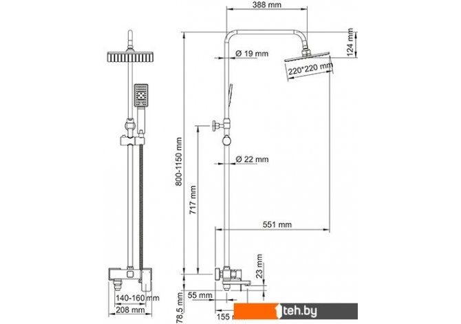 | Диаметр (ширина) верхнего душа | 220 мм |