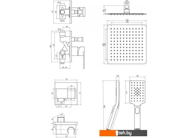 | Диаметр (ширина) верхнего душа | 250 мм |