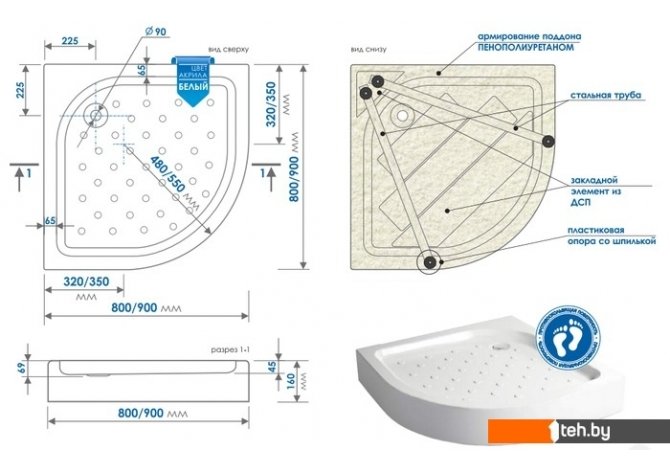 | Информация | Плавные линии поддона и стильная цельнолитая форма идеально впишутся в современный интерьер. Поддон имеет оптимальный баланс глубины и ширины слива, для комфортного принятия душа. Сливное отверстие диаметром 90 мм и точно выверенный угол уклона дна, обеспечивают слив до 50 литров воды в минуту, это позволяет принимать душ без ограничений мощности потока и опасения перелива воды.Поддон изготовлен из ударопрочного и стойкого к царапинам сантехнического акрила белоснежного цвета GEBAU Kunststoff (Германия). Бактерицидные свойства сантехнического акрила GEBAU AG обеспечивают высокий уровень гигиеничности.Опорная конструкция, которая армируется слоем жесткого ППУ вместе с поддоном придает изделию максимальную устойчивость и надежность. Встроенный металлический каркас с 6 опорными ногами позволяет поддону выдерживать нагрузку до 300 кг, подходит не только для домашнего использования, но и для общественных мест с высокой проходимостью. Сварной металлический каркас и регулируемые по высоте ножки играют роль надежного «фундамента» для установки ограждений.Дополнительная плотная фиксация поддона к стенам при помощи кронштейна позволяет исключить возможность образования грибков и размножению микробов.Небольшая высота поддона позволят создать комфортный и безопасный вход в душевую зону. |