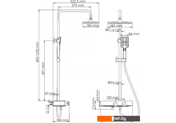 | Диаметр (ширина) верхнего душа | 185 мм |