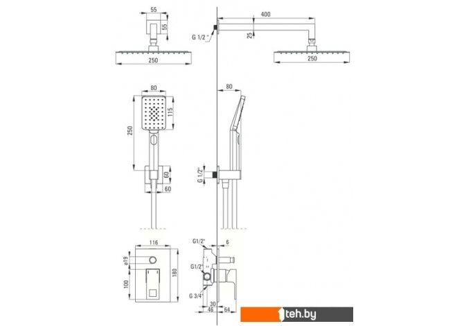 | Диаметр (ширина) верхнего душа | 250 мм |