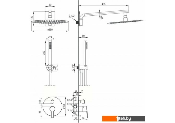 | Диаметр (ширина) верхнего душа | 250 мм |