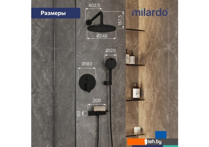 | Комплектация | верхний душ, ручной душ (лейка), держатель лейки, шланг, смеситель |